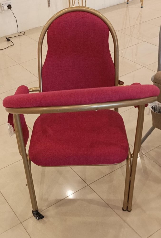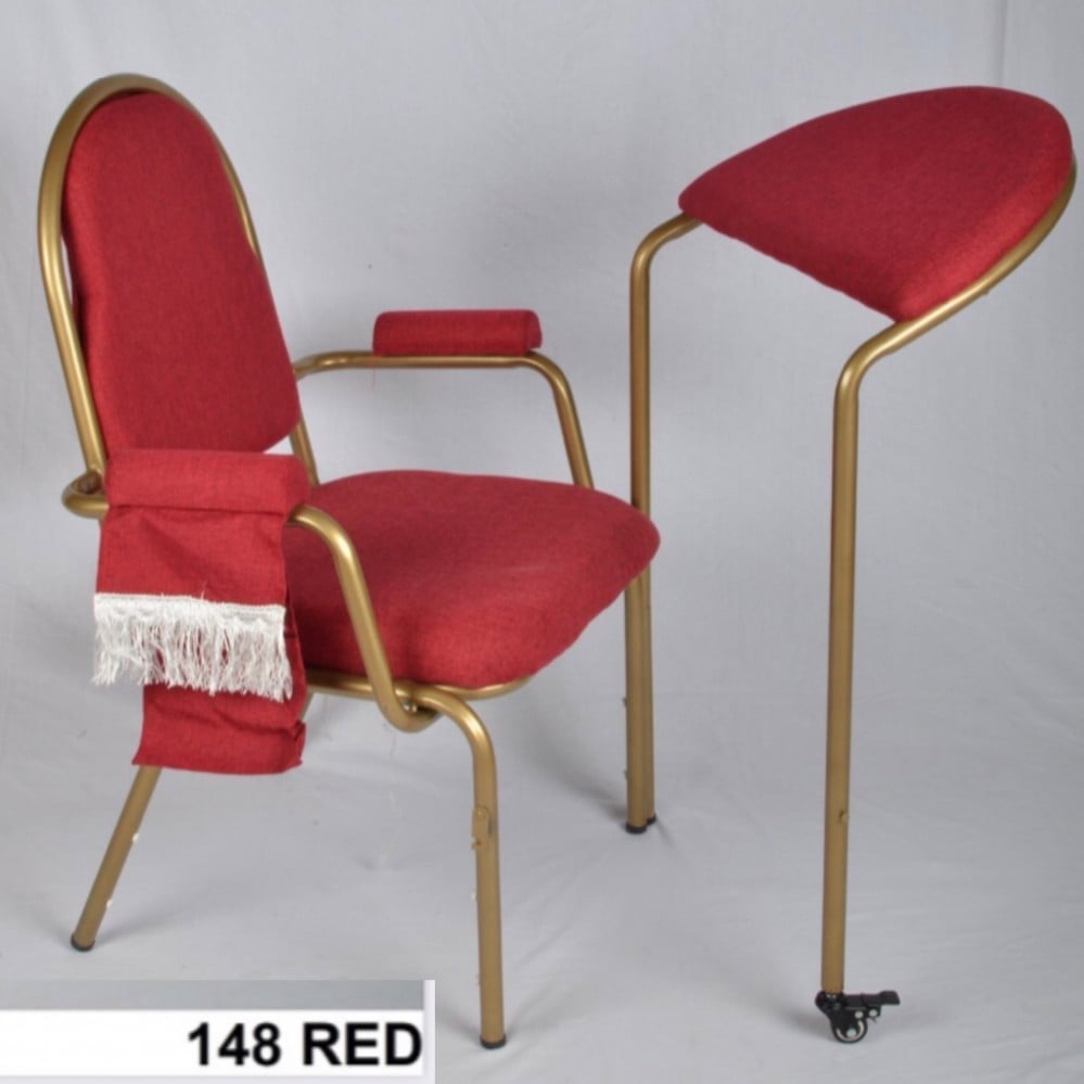 للاستمتاع بالراحة النفسية خلال الصلاة الكرسي مصنوع من الحديد المتين والمقاوم للكسر والاهتراء والمزود بحامل أمامي مثبت من أحد الأطراف بالكرسي وحر الحركة في الطرف الثاني من خلال دولاب سفلي صغير لتأمين حرية الحركة هذه الكرسي منجد باستخدام المخمل الناعم المبطن بالإسفنج ومزود بجيب جانبي لوضع المسبحة والنظارات والموبايل